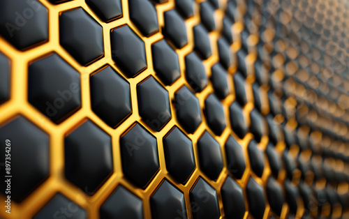 The watermark will not be included on Wall mural.: Close-up of a black and gold honeycomb pattern, creating a striking geometric background with modern
