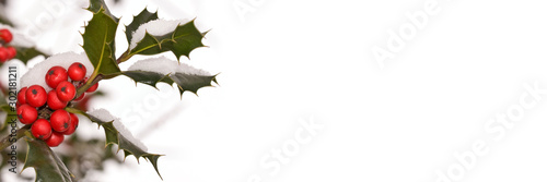 Wall mural close up of a branch of holly covered with snow in a garden, christmas and holiday panoramic backgro - Wall murals Wall mural close up of a branch of holly covered with snow in a garden, christmas and holiday panoramic backgro - Wall murals