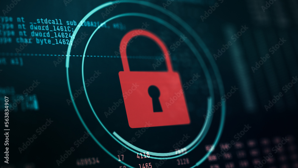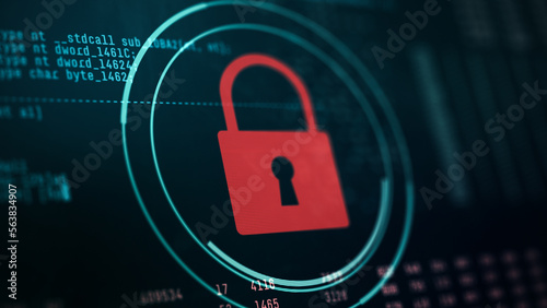 Close-up of a computer monitor, random data and code on background, circular futuristic hud with a pWall mural