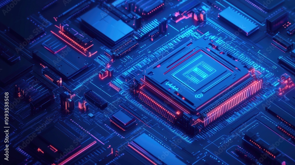The watermark will not be included on Wall mural.: Close-up of a computer processor on a circuit board, illuminated with blue and pink neon lights -