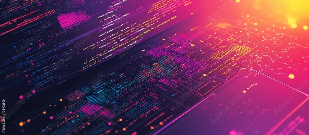 The watermark will not be included on Wall mural.: Close-up of a computer screen with lines of colorful code displayed - the screen is glowing with a wa