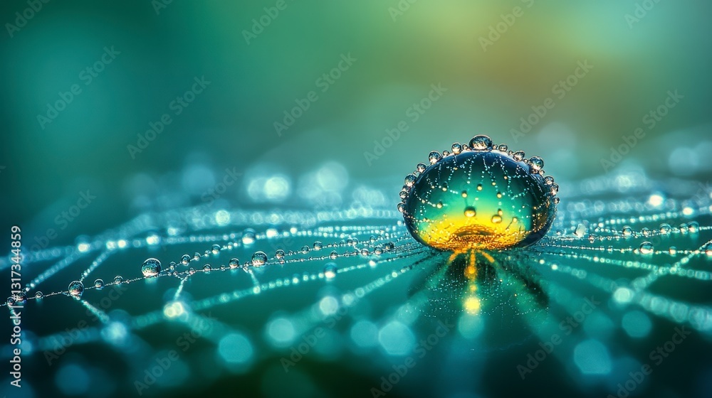 The watermark will not be included on Wall mural.: Close up of a dewdrop on a spiderweb, illuminated with soft light, showcasing intricate web details