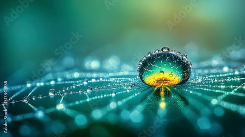 Wall mural close up of a dewdrop on a spiderweb, illuminated with soft light, showcasing intricate web details