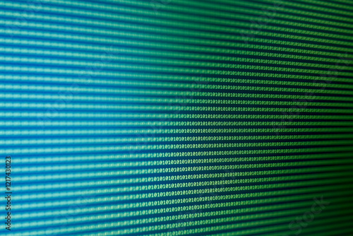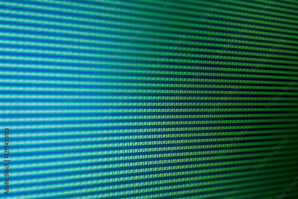 The watermark will not be included on Wall mural.: Close-up of a digital display featuring binary code in blue and green tones, representing technology