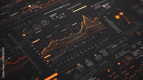 The watermark will not be included on Wall mural.: Close-up of a digital interface with data and charts in orange and white on black background