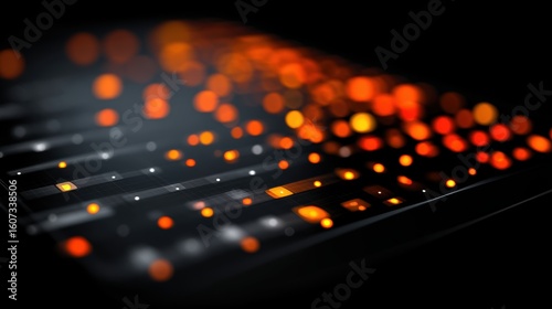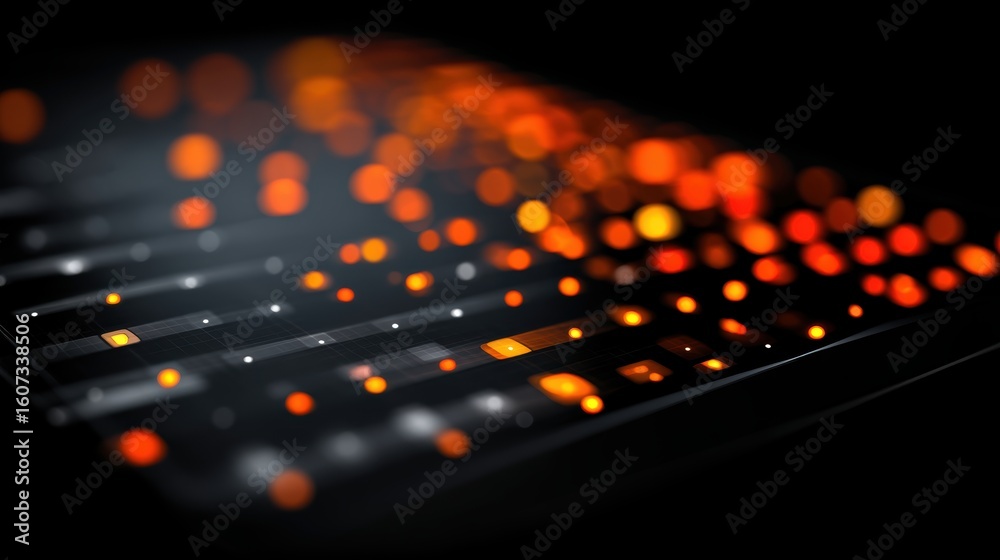 The watermark will not be included on Wall mural.: Close-up of a digital interface with orange glowing light dots and lines forming an abstract futuris