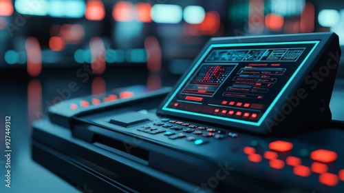 Wall mural : Close-up of a futuristic control panel with a digital display in a high-tech command center, featuri