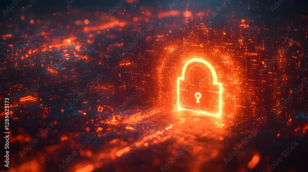 Wall mural close-up of a glowing digital padlock amid binary code and data streams, symbolizing cyber security. - Wall murals Wall mural close-up of a glowing digital padlock amid binary code and data streams, symbolizing cyber security. - Wall murals