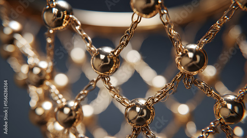 Close up of a golden chain net with spherical beads against a blurred background in soft lightingWall mural