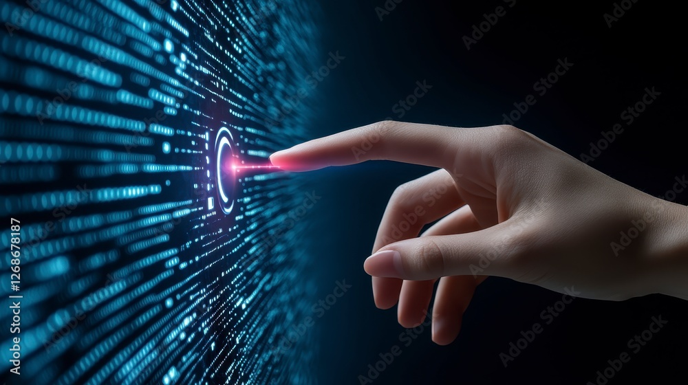 Wall mural close up of a hand interacting with a digital screen displaying blue and red binary code. the finger