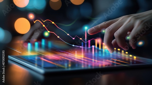 Wall mural : Close-up of a hand interacting with a tablet screen displaying colorful graphs and data -