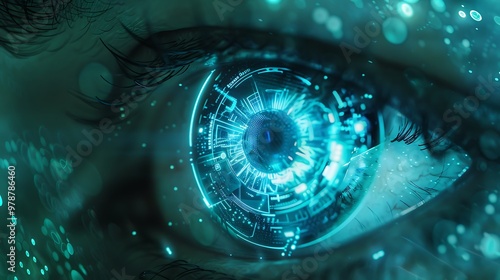 The watermark will not be included on Wall mural.: Close-up of a human eye with a digital interface superimposed, representing the intersection of tech