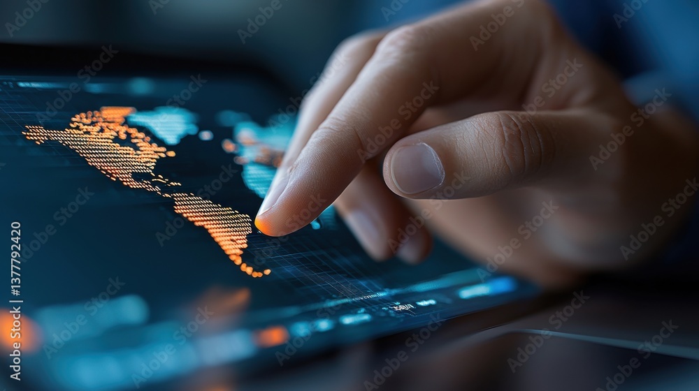The watermark will not be included on Wall mural.: Close up of a human hand using fingers to navigate and explore a digital world map displayed on the