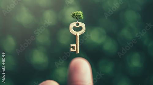 The watermark will not be included on Wall mural.: Close-up of a key floating above a hand reaching upwards, illustrating the aspiration and determinat