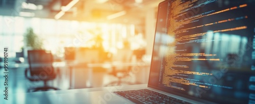 Wall mural : Close-up of a laptop with code on the screen in an office, with a blurred background and sunlight st