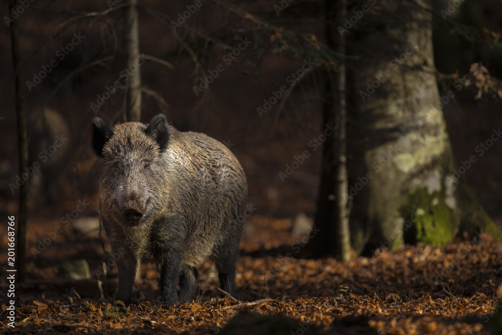 The watermark will not be included on Wall mural.: Close up of a large wild boar sus scrofa swine calm woman walking and search using snout looking foo