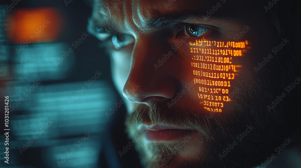 Wall mural close-up of a man's face with binary code projected onto his skin. - Wall murals Wall mural close-up of a man's face with binary code projected onto his skin. - Wall murals