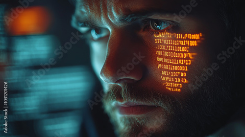 Wall mural : Close-up of a man's face with binary code projected onto his skin -
