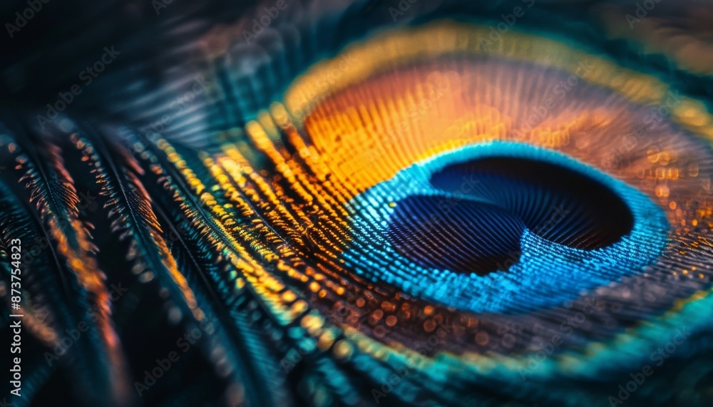 The watermark will not be included on Wall mural.: Close-up of a peacock feather, focusing on the vivid iridescent colors and intricate pattern