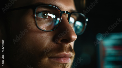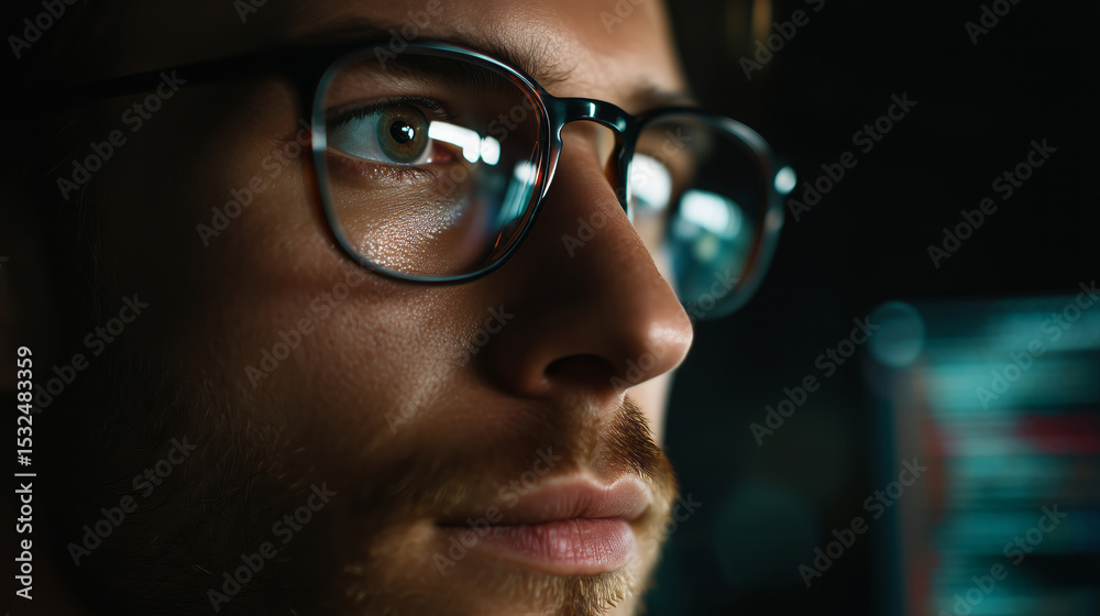 The watermark will not be included on Wall mural.: Close-up of a programmer analyzing code through reflective eyeglasses