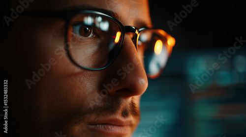The watermark will not be included on Wall mural.: Close-up of a programmer wearing glasses with code reflections on lenses