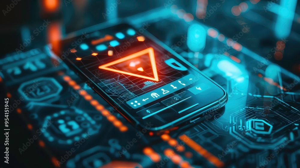 Wall mural : Close-up of a smartphone with an orange triangular icon and a futuristic interface -