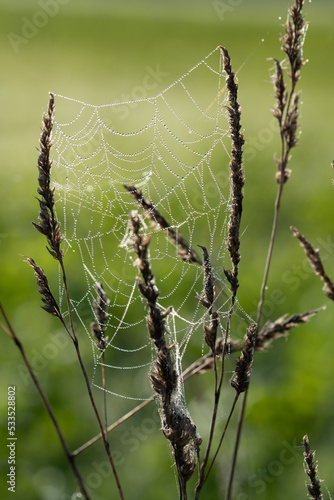 Wall mural : Close up of a spider web attached between grasses - drops of dew sit on the net - the background is gr