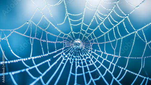 Wall mural : Close-up of a spider web covered in morning dew, with fog
