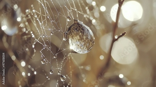 The watermark will not be included on Wall mural.: Close-up of a spider web on tree branch with water droplets