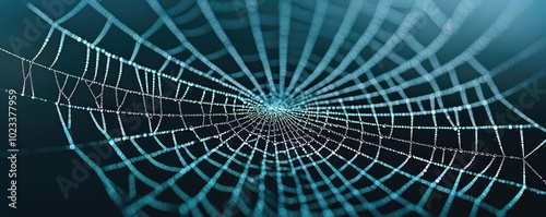 The watermark will not be included on Wall mural.: Close-up of a spider web showcasing intricate patterns and drops of dew, set against a dark backgrou