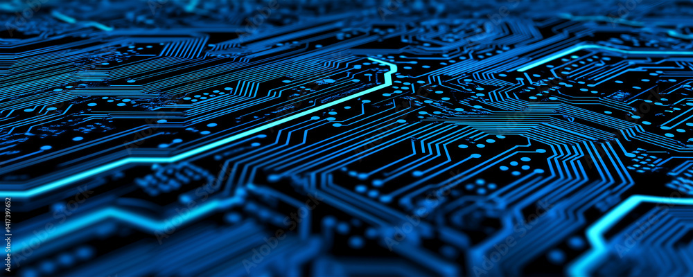 Close-up of a stylized circuit board with intricate, glowing blue lines tracing complex patterns - thWall mural