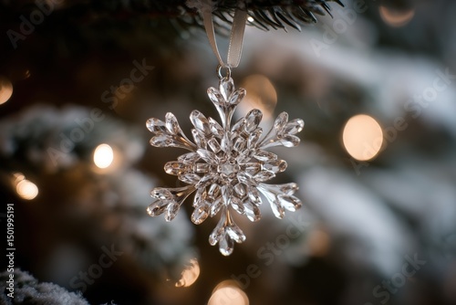Wall mural close-up of a white snowflake ornament hanging on a green christmas tree with soft bokeh lights. - Wall murals Wall mural close-up of a white snowflake ornament hanging on a green christmas tree with soft bokeh lights. - Wall murals