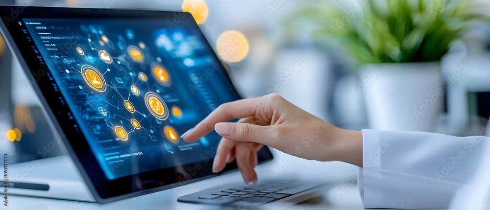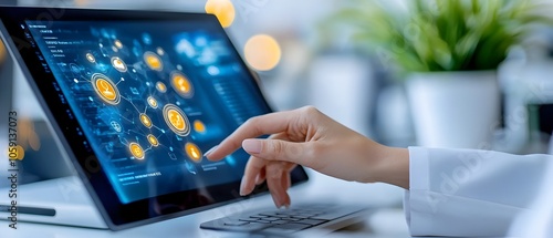 Wall mural : Close up of a woman s hand interacting with a glowing futuristic holographic display interface showc