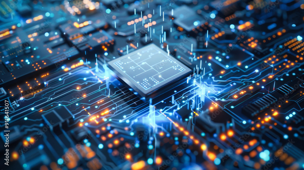 Wall mural : Close up of an advanced microchip with data flowing through it