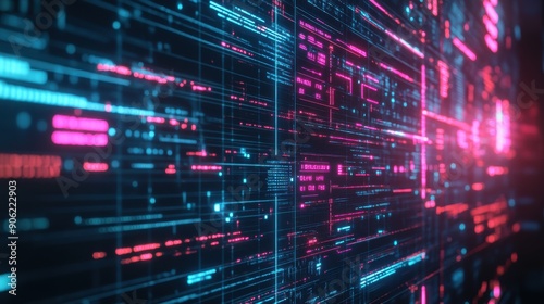 Close-up of an ai hologram with neon light accents, displaying data streams and digital code in a daWall mural