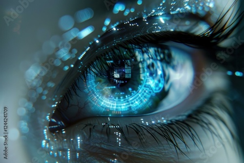 The watermark will not be included on Wall mural.: Close up of an eye with glowing digital interface, representing the integration of technology with h