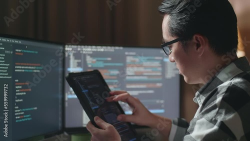 Wall mural : Close up of asian male programmer looking at database on tablet while creating software engineer dev