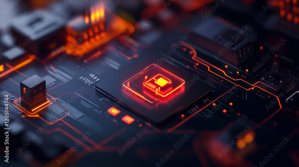 The watermark will not be included on Wall mural.: Close up of circuit board with glowing components and intricate details