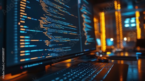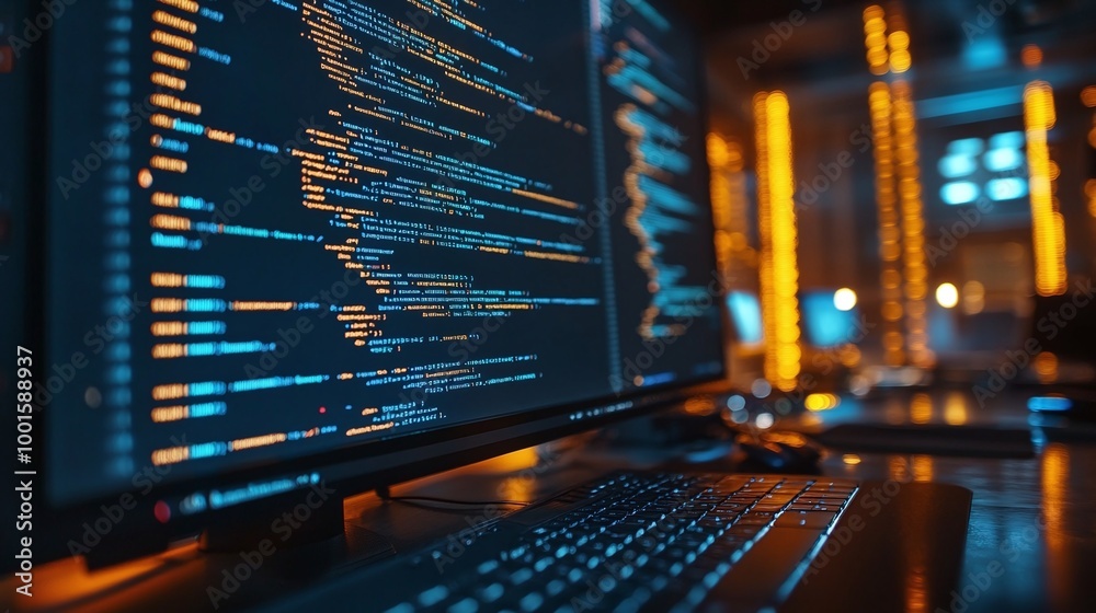 Wall mural : Close-up of code on a computer monitor, highlighting the intricate coding concepts and software deve
