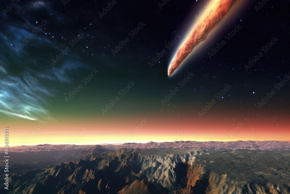 Wall mural : Close-up of comet with earth in the background, created with generative ai