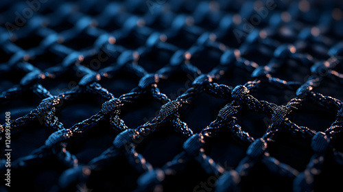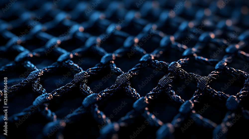 Wall mural : Close up of dark blue knitted netting with small knots in studio lighting creates an abstract textur