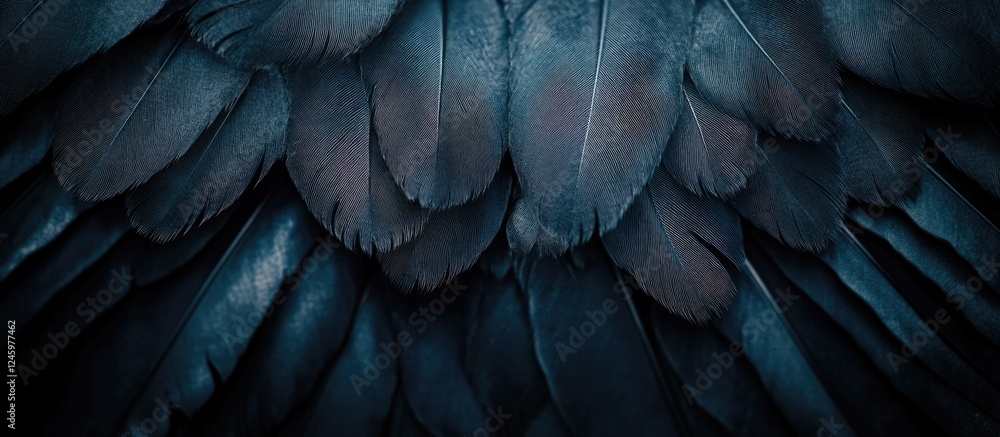 The watermark will not be included on Wall mural.: Close up of dark raven wings showcasing intricate feather patterns with a soft texture perfect for n