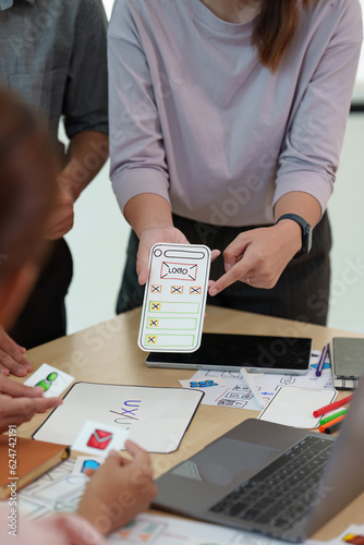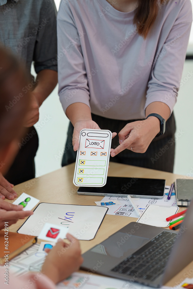 Wall mural : Close up of developer and ui designer brainstorming interface wireframe design - creative digital deve