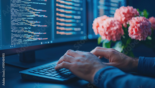 Wall mural close up of developer hands typing on keyboard, surrounded by colorful flowers and computer screens