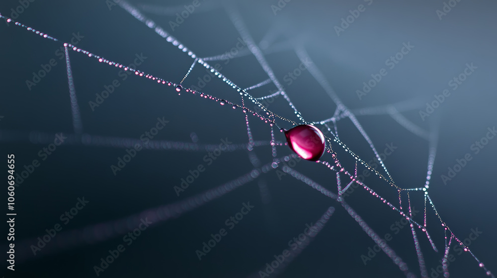 The watermark will not be included on Wall mural.: Close up of dewdrops on spiderweb, showcasing intricate patterns and vibrant red droplet - delicate w