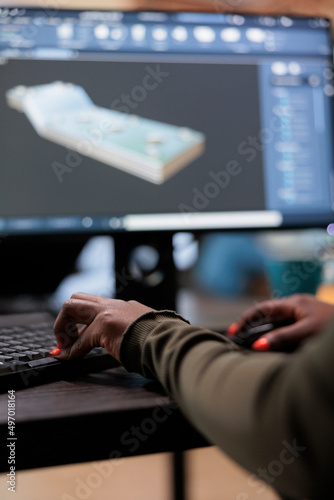 Wall mural : Close up of digital artist working on 3d model to improve geometry and optimise project - graphics in