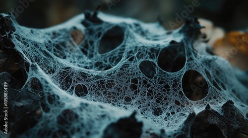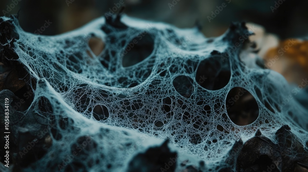 The watermark will not be included on Wall mural.: Close-up of eerie, delicate egg-shell webs formed from fallen foliage, revealing their intricate pat