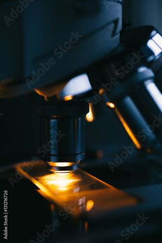 The watermark will not be included on Wall mural.: Close up of examining of test sample under the microscope in laboratory -