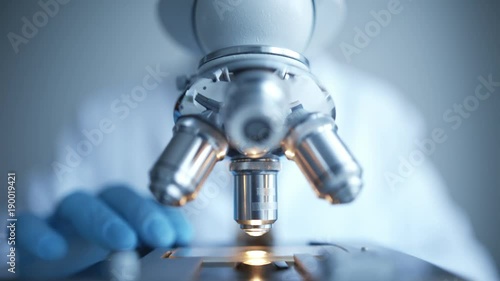 The watermark will not be included on Wall mural.: Close up of examining of test sample under the microscope in laboratory -