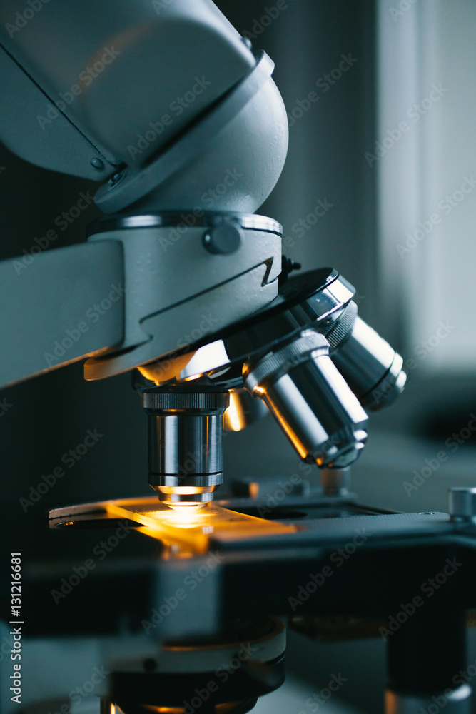 The watermark will not be included on Wall mural.: Close up of examining of test sample under the microscope in laboratory -